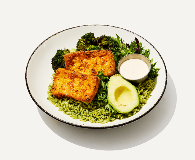 Crispy tofu, avocado, charred broccoli with lemon, farm greens, and herb rice served with a side of garlic aioli.