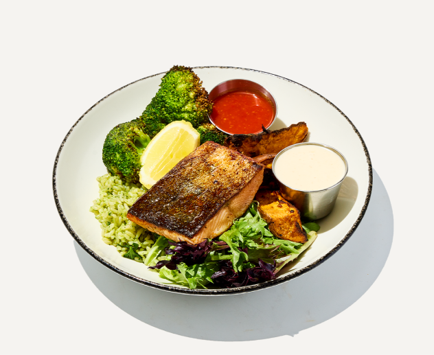 Seared wild salmon served on herb rice and mixed greens alongside roasted sweet potatoes, charred broccoli with lemon, with sides of garlic aioli and sriracha.